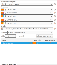 Wir freuen uns über eine Spende für das 3D-gedruckte Teil. Durch Betrieb, Wartung und das Material entstehen Kosten. Diese Kosten wollen wir über Spenden decken. Richtwert für eine Spende sind 10 Cent (0.10€) pro Meter (32,74€/kg). Die Spende kannst du in die Spendendose beim 3D-Drucker werfen. Der Prusa Slicer zeigt für jeden Druck an wie viel Meter etwa verbraucht wird (siehe Bild).